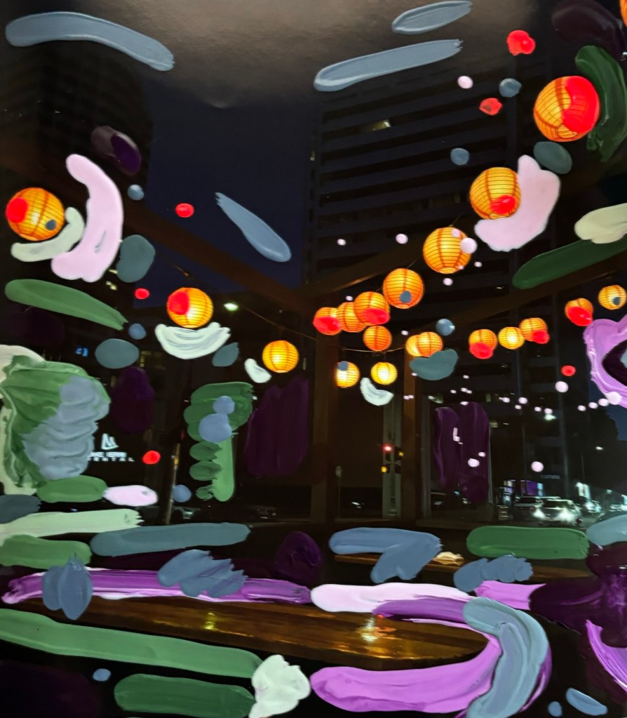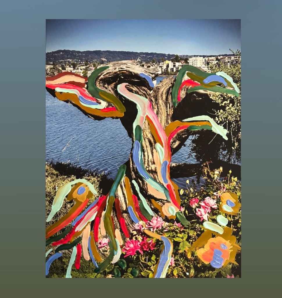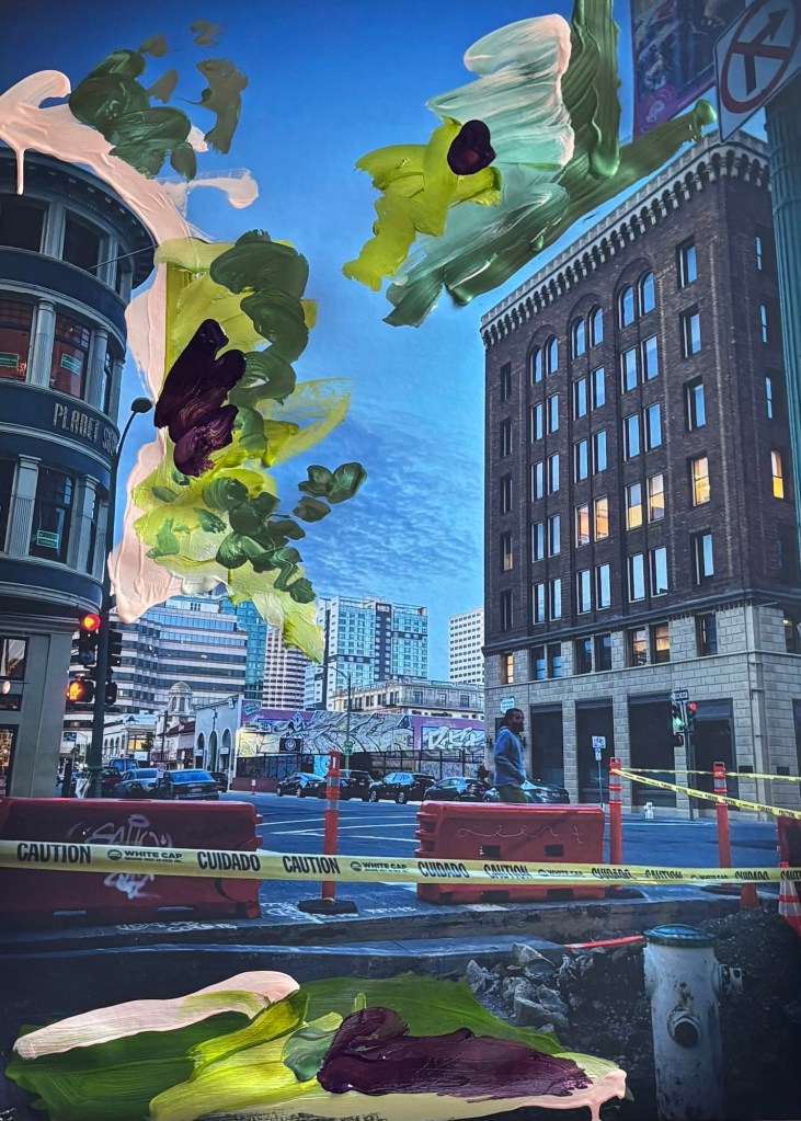 During the pandemic, Emily developed a new process, combining both her digital photography of places throughout the Bay Area and applies acrylic paint over them. She has been nailing these multimedia paintings on prints into birch panel which serves as a smart alternative to having to frame the piece.